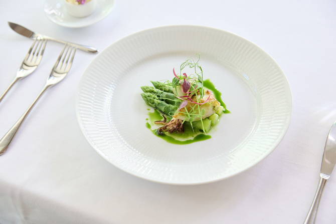 ランチは魚か肉を選ぶ「Chapeauコース」(4042円)、魚と肉の両方が付く「BORNコース」(5775円)があります。伝統的なフレンチの技法を用い、時間をかけて作られる料理は素材の味が際立ち絶品。真っ白なお皿に盛り付けられた様子は色彩豊かで食欲をそそります。専属ソムリエがセレクトしたワインとの相性も抜群です。