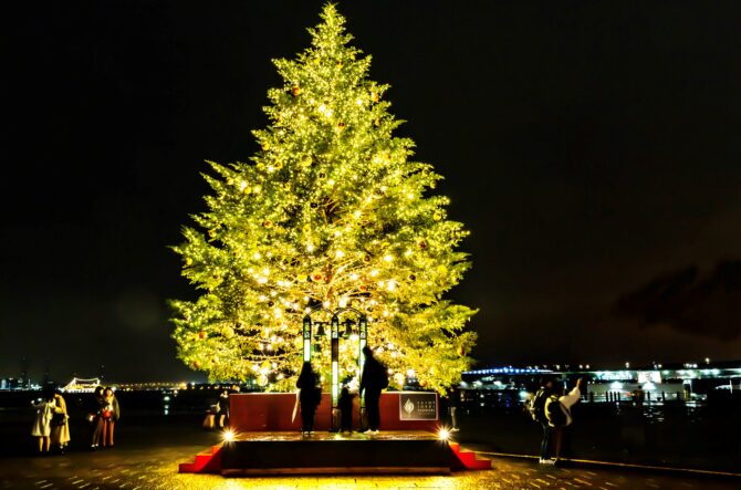 2025年のクリスマスは、スタイルエディトリアルブランド「niko and …(ニコアンド)」とコラボレーション!ベイエリアの夜景を臨む広場に「niko and …」のオーナメントで装飾された高さ8mの生木など計10本のクリスマスツリーが登場。