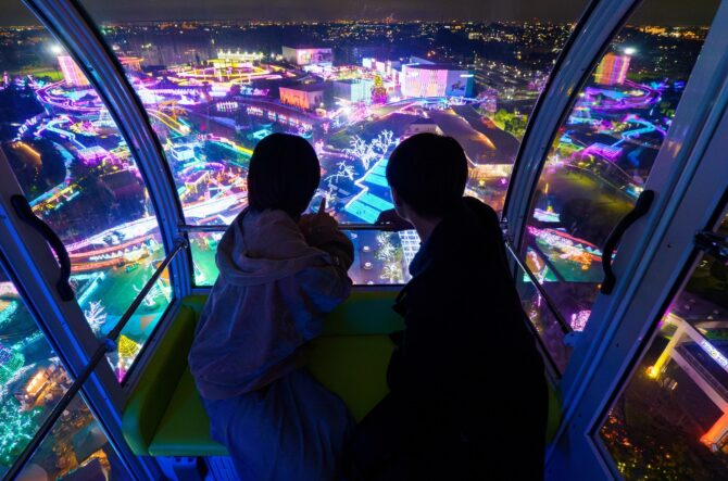 2024年にオープンした新観覧車「Sky-Go-LAND」からは、東京の大夜景と宝石色のイルミネーションを一望することができる。