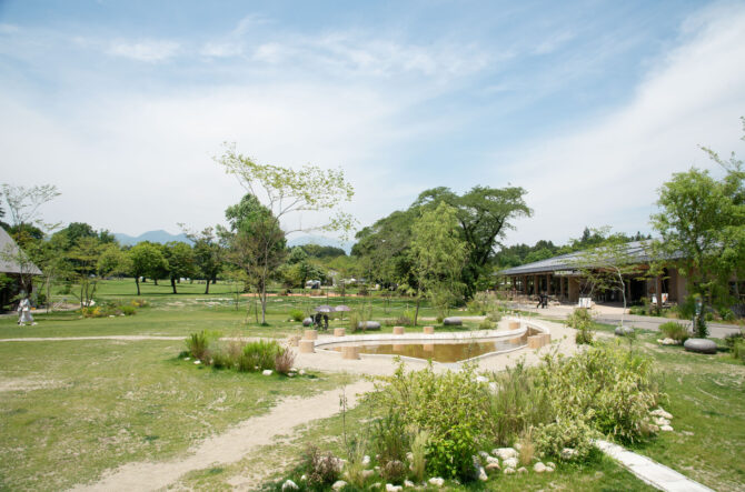 牧場には、自然景観を一望できる「千本松テラス」が整備され、モミジやアカマツなど50種類以上の植栽や約11,000㎡の天然芝と四季折々の風景を楽しめる。