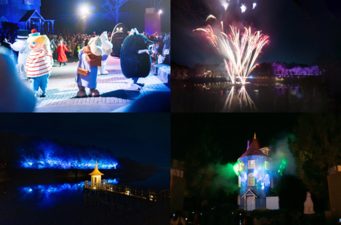 日が落ちてからはライトアップやプロジェクションマッピングなどの光の演出が加わり、2024年に好評だったナイトパレードがバージョンアップ!ムーミンバレーパークを訪れる人々を幻想的なクリスマスの世界へと誘う。さらに、冬の湖上花火大会も開催。