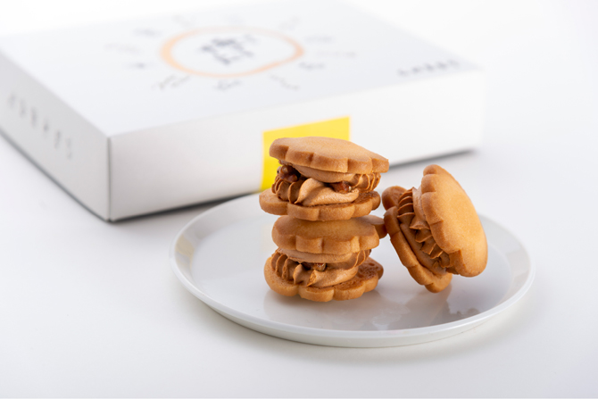 オリジナルのプレス機を使い、和菓子の「はさみ焼き」の技術で焼き上げたこだわりのクッキーに、福岡県産のあまおう苺を贅沢に使用した風味豊かなバタークリームとバターキャラメルをサンド。
