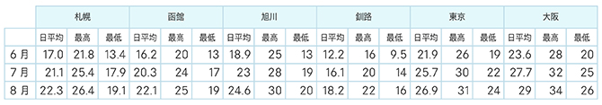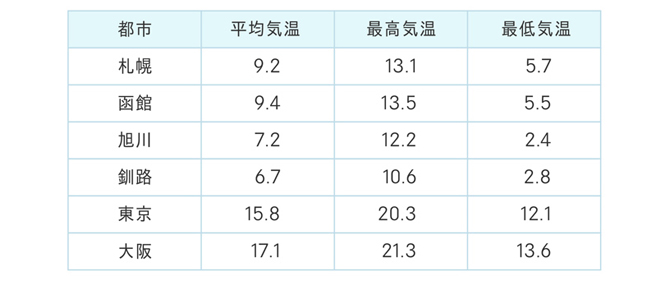 札幌、函館、旭川、釧路の北海道主要都市と、東京、大阪の気温を比較すると、北海道の方が、気温差が大きいのが特徴です。