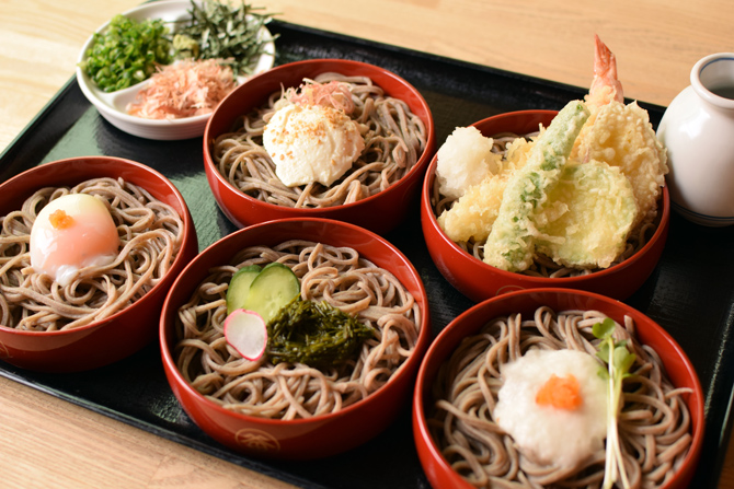 「五色割子そば」はエビや野菜の天ぷらにおぼろ豆腐、なめこおろし、温泉たまご、とろろ芋がのった五段の割子そば。見た目の華さかさに顔がほころび、食べ応えも満点です。