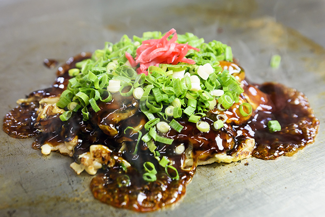 出汁と卵を入れた生地に粗みじんのキャベツをのせ、その上には生地が隠れるくらいカキをたくさん並べ、青ネギと一緒に焼くのが特徴です。しっかりとした甘味と酸味を含んだ「イカリソース」をベースに作るオリジナルソースで味わいます。