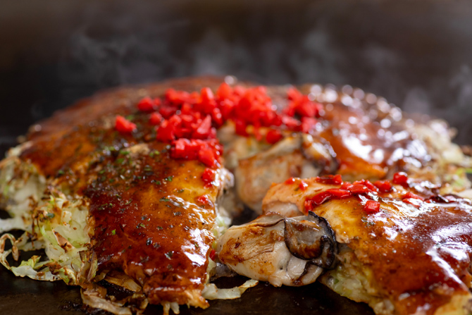 岡山の漁師町・日生(ひなせ)の漁師さんの間で、昔から食べられていたといわれる「カキオコ」。界隈がカキの名産地であるため、新鮮なカキをたっぷり使い手軽に作ることができるお好み焼きは重宝されたそうです。近年はB級グルメイベント出店を機に、全国的に知名度が上昇し地元の人や観光客にも親しまれています。