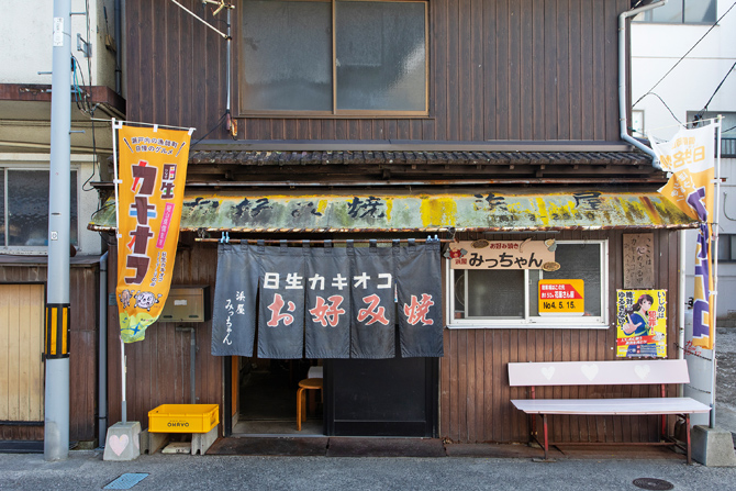 JR日生駅のすぐ裏手にある、こぢんまりとしたお好み焼き店。カキの鮮度にこだわり、“シンプルさが一番!”をモットーとし丁寧に日生焼きを焼いています。