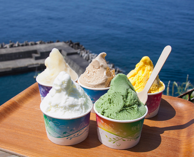 明日葉や海苔といった名産はありますが、食事のできる場所は限られており、基本的には宿泊施設での食事となります。ただし、島内唯一のお土産屋(2023年5月時点)である「ふくまる商店」では島の食材で作るオリジナルジェラートが食べられます。