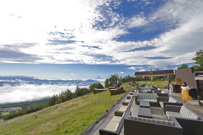 清里エリアで一番標高の高い場所に位置するサンメドウズ清里の山頂エリアにある「清里テラス」では、爽快な八ヶ岳ブルーの空、富士山や野辺山高原の絶景が楽しめますよ。