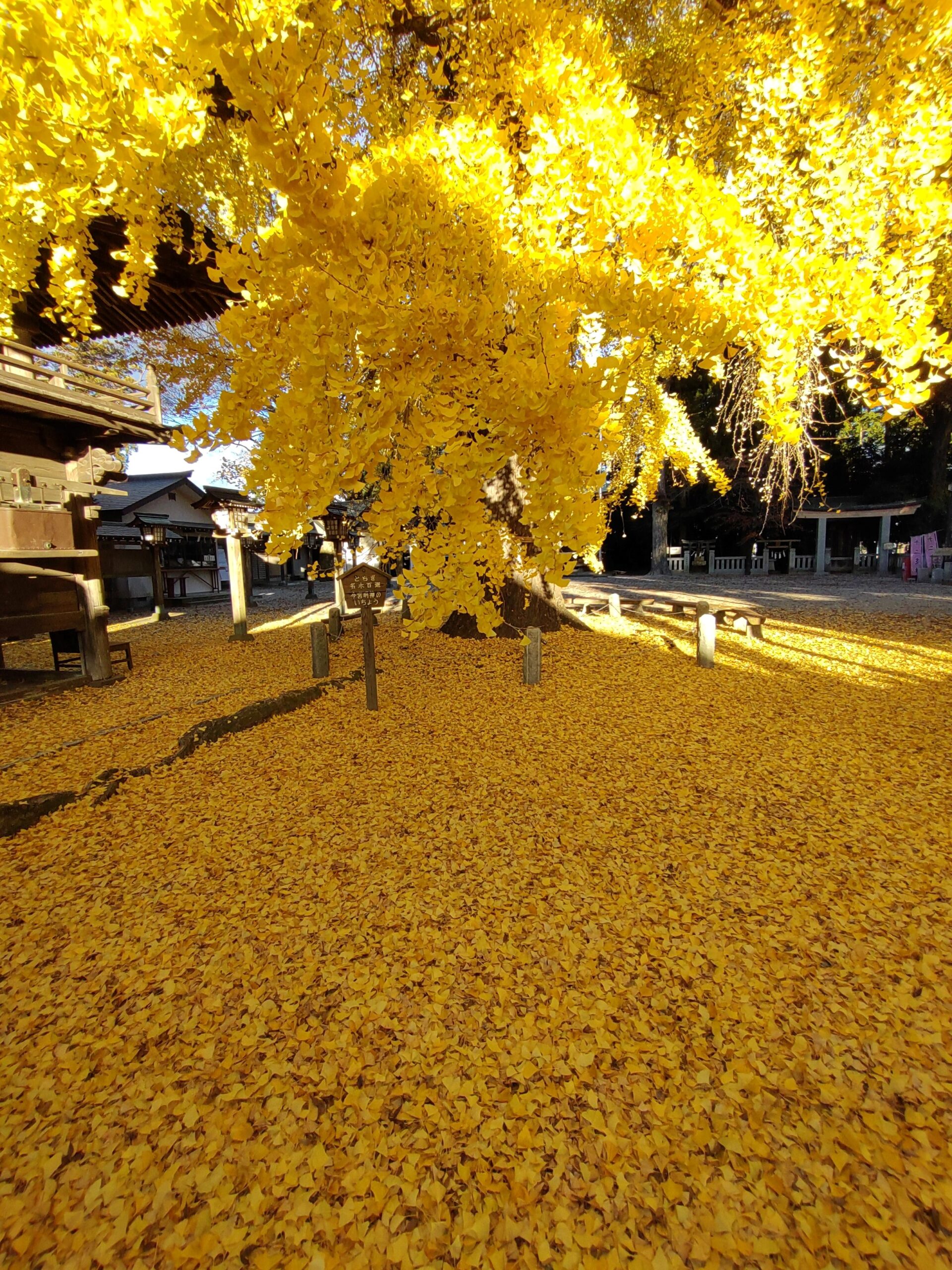 平安時代創建の神社のシンボルは、境内にそびえる大公孫樹(大いちょう)。高さ25m、太さ4.6mの巨木でさくら市指定天然記念物でもあります。11月中旬には黄金色に染まりライトアップも。