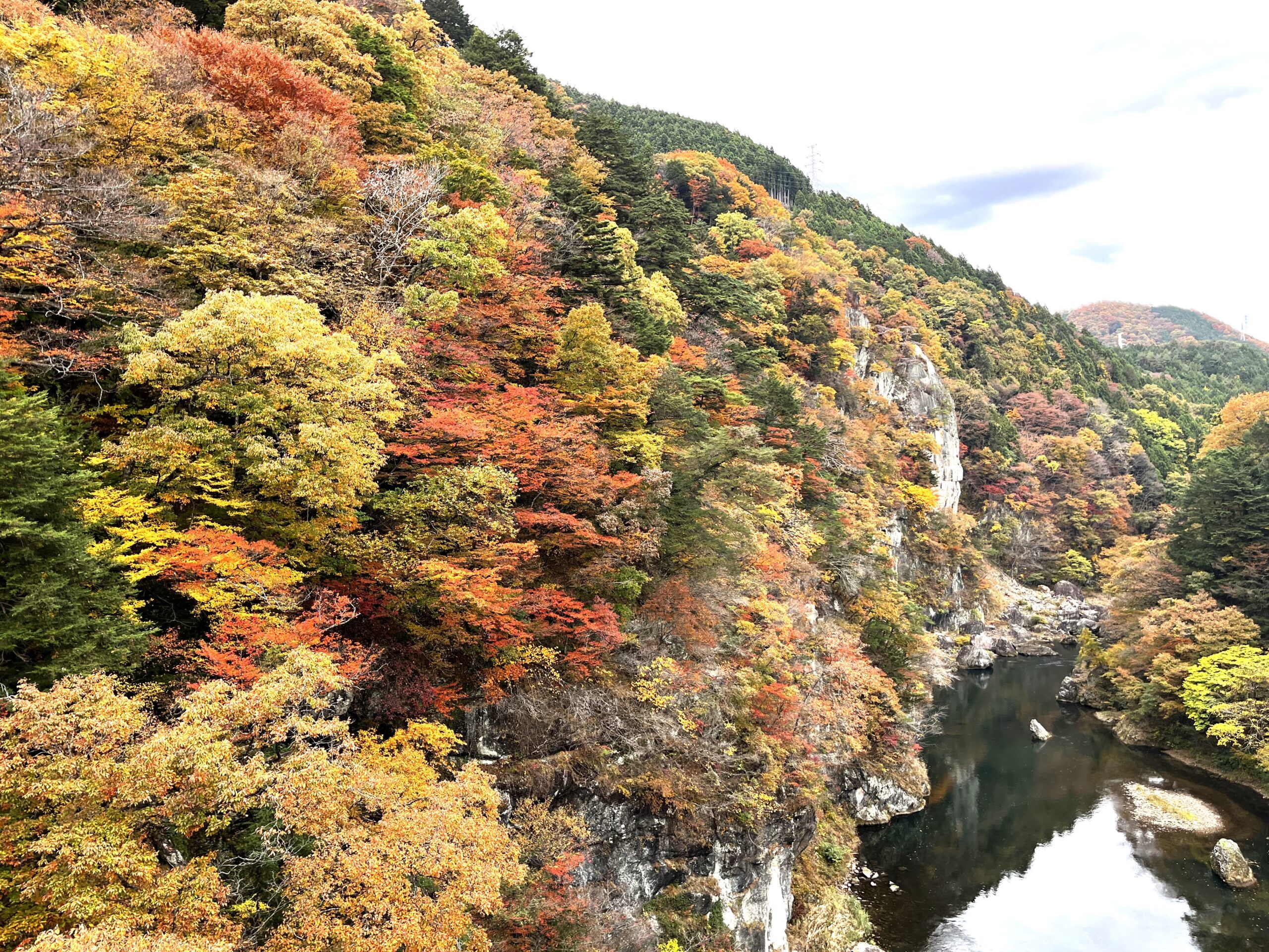 多摩川の支流、約20㎞に及ぶ渓谷。美しいイチョウの黄とモミジの赤が見られます。吊り橋の石舟橋は絶好のビュースポットです。