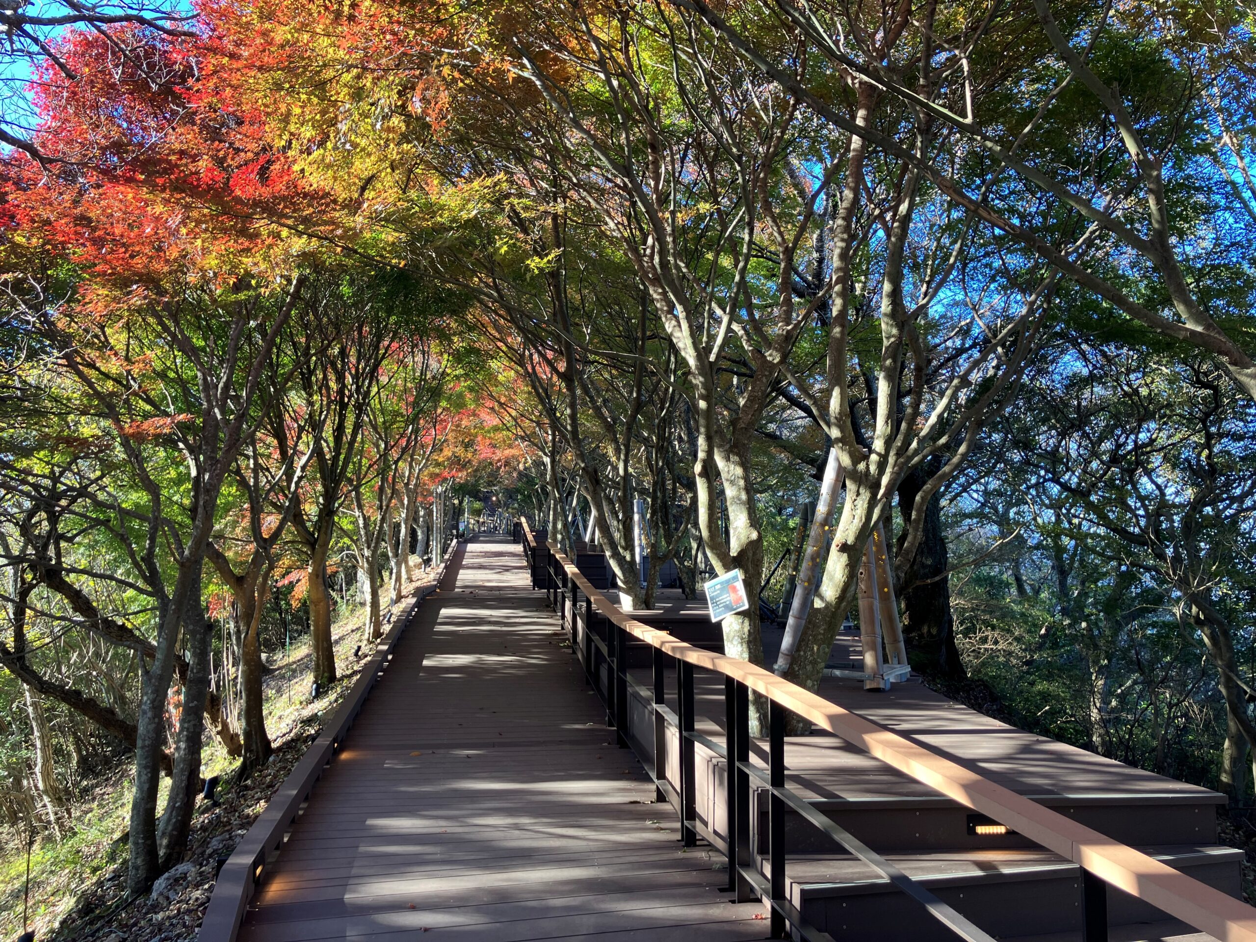 梅の花が有名な熱海梅園ですが、カエデ類の樹木も約380本あり、紅葉名所として知られています。特に朱色の駐杖橋付近は紅葉との調和が美しく、おすすめのフォトスポット。イベント期間中はライトアップや足湯が楽しめるほか、土日祝は甘酒が振る舞われます。