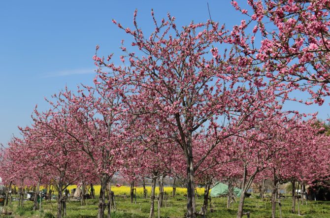 花桃(はなもも)だけでなく、レンギョウや数種類の桜、ボケなどが咲き競う様はまさに百花繚乱!美しい花々に、心がときめきます。