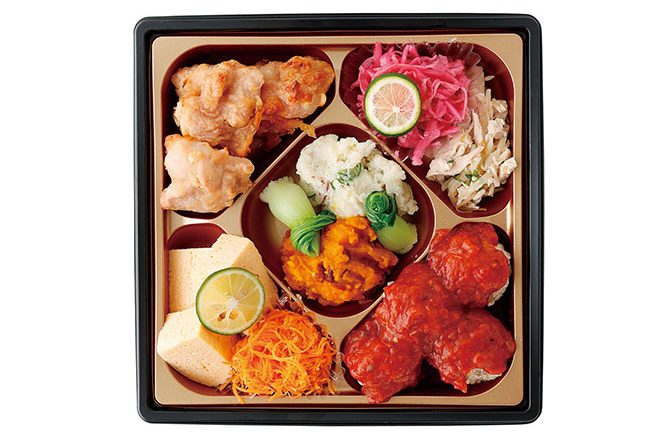 日本料理「えさき」の江崎新太郎氏がプロデュースするお弁当店の人気商品。だしをベースに塩分控えめにした唐揚げ、ミートボール、だし巻き卵など、8種の人気のおかずをプレートに。