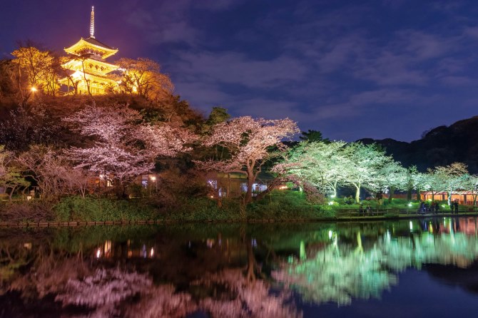 大池越しに見る三重塔と桜の組み合わせが素敵。風のない日は桜が水面に映り込んで絶景!