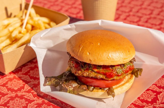 生産高と肉質の良さで評判の都城産の宮崎牛と木炭入りのエサで上質な赤身と脂に仕上がった観音池ポーク。この2つが生み出す絶品ハンバーグをサンド。トマトソース&バジルのイタリアンの他、和風の照り焼き(650円)もあり。