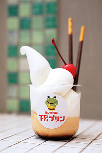 店頭のカエルや湯船のような店内スペースが話題。下呂牛乳や天然バニラビーンズで作るプリンは、抹茶や珈琲ゼリーなど味も様々です。
