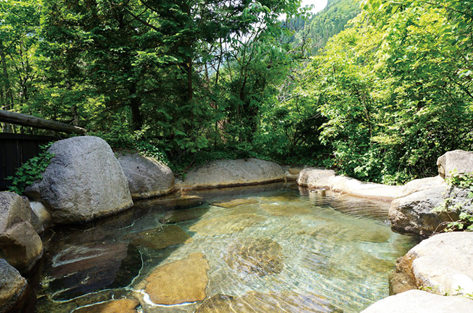 広大な敷地に男女合わせて16カ所もの露天風呂が点在。木々や山並みを望みながら、湯あみを満喫できます。