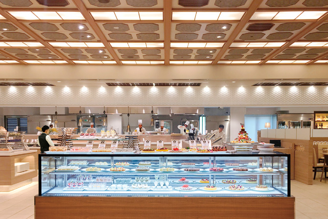 レストランに入ると色とりどりのスイーツに迎えられ食欲全開に。背後の全長約18mもの大型ライブキッチンからは箱根山麓豚や駿河湾の幸を使った約50種類の品が繰り出され、何から食べるか迷う!