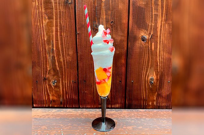 地元産の牛乳を使ったソフトクリームと、シャンパンの王道ブランド「モエ・エ・シャンドン」を組み合わせたリッチなメニュー。シャンパンのなかにはフローズンフルーツが入っており、見た目の華やかさも格別です。