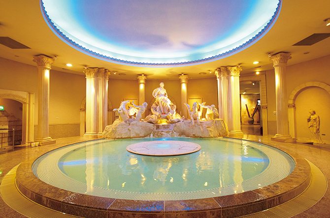 「ヨーロッパゾーン」と「アジアゾーン」(男女月替わり制)を合わせ、世界11カ国25種類もの浴槽が勢ぞろいした温泉テーマパーク。8カ国の岩盤浴が並ぶ「岩盤浴ゾーン」は別途有料。
