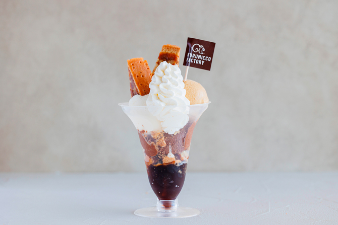 「The Factory’sクルミッ子パフェ」は、塩キャラメルアイスとミルクアイス、クルミ、チョコレートムース、コーヒージュレなどが入った、クルミッ子の味わいを楽しめるパフェです。