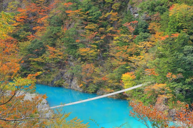 一度に10人まで渡れる高さ8m、長さ90mのつり橋。つり橋が揺れるドキドキ感を味わいながら秋は紅葉も一望。つり橋へは寸又峡温泉街から徒歩30分。散策コースは一方通行なので一周90分の道のりですが、紅葉絶景が待ってます。