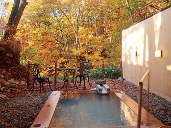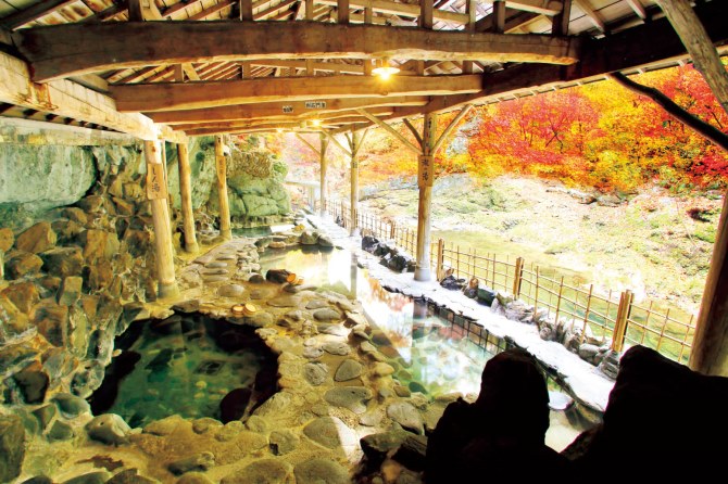 ワイルドな露天がある山の上の一軒宿。混浴だが女性は湯浴み着OK(販売1500円)。中でも眺望露天風呂は正面に兜山を望み、オレンジに染まった木々の共演を楽しめる。澄んだ空気で深呼吸して。