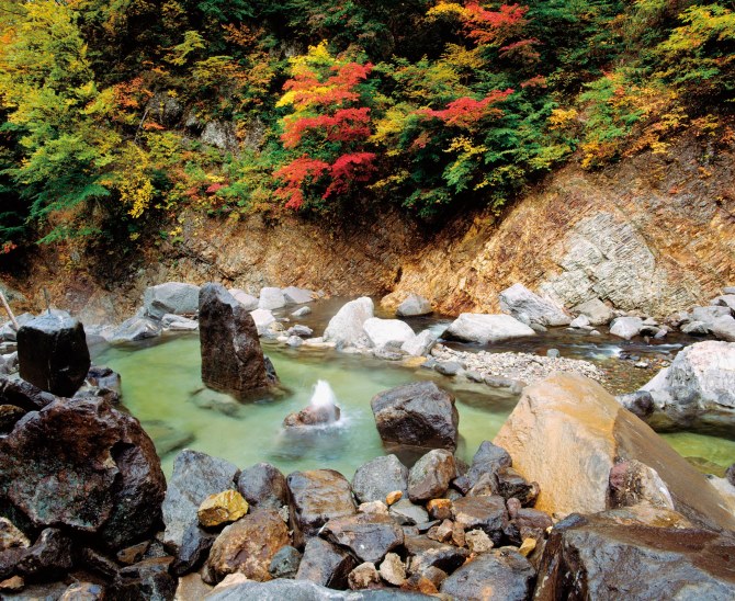東北三大美湯のひとつに数えられる源泉使用(加水)の湯。高地ならではの冷たい風、硫黄の香り、肌当たりの良い湯、そして紅葉の眺めと五感がフルで刺激される。露天だけでなく風情ある檜の内風呂も風情満点。
