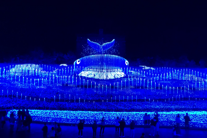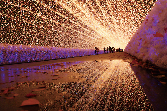 毎年変わるメインテーマを題材にしたイルミネーションや、定番人気の「光のトンネル」など、約30万平米の敷地に圧倒的な光の世界が展開。LEDの色味や発光タイミングを調整することで流れる川を演出するなど、高い技術力と表現力で多くの人を魅了します。