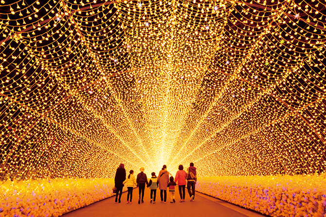 雄大な自然を生かしたイルミは、約300万球もの光に加え、音やプロジェクションマッピングで360度の煌めきに包まれる。見る人を圧倒する多彩なプログラムを楽しんで。
