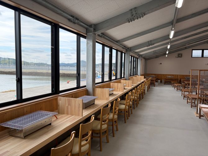 岐志のバス停から最も近く、漁師の自宅を改装した隠れ家的な店舗。他のカキ小屋との一番の違いは、天気が良い日はお庭に席を出し、ペット連れや子連れでも気兼ねなく楽しめるところ。平日・週末ともに事前予約が確実。