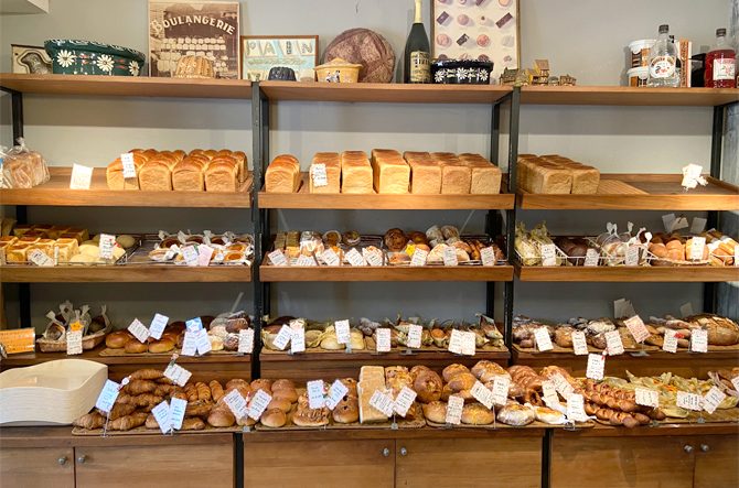 店頭にはハード系を中心に、ブルーチーズやサラミを使ったパンなど、ワインを片手に楽しみたい食事パンが充実。どんな料理やワインとあわせたいのか相談すればおすすめを選んでくれますよ。また焼き菓子も好評。種類も年々増えているのでお見逃しなく。