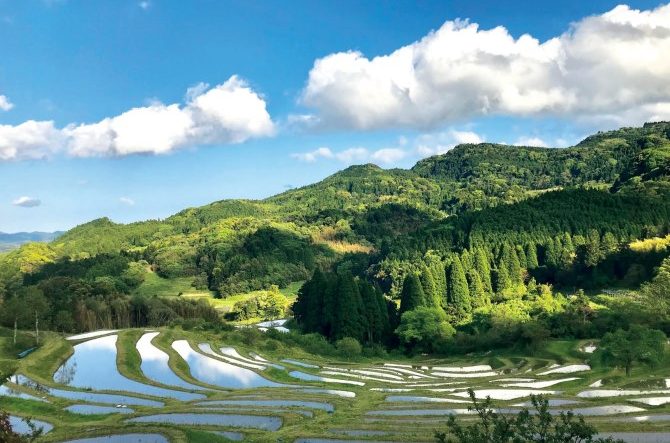 オーナーを募り、農業体験の場を提供し、美しい棚田を保全。見学は自由で、4月頃は田植え前の水を張った状態。375枚の棚田が水鏡になり、青空や雲、里山の風景を映し出す。