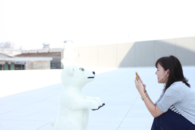 撮影OKな展示作品が多いのもこの美術館の特徴で、2階の屋外広場では「ANIMALS」で知られる彫刻家・三沢厚彦氏のクマとツーショット撮影も叶います。
