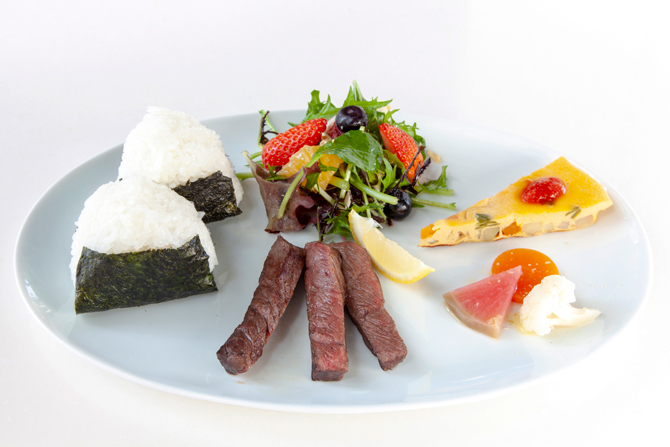 ここからはおすすめのメニューを紹介。まずは長崎県産の有機栽培米で作ったおにぎり、長崎生まれの和牛ブランド“出島ばらいろ”のステーキなど、地元産のこだわり食材を集めた贅沢プレート。