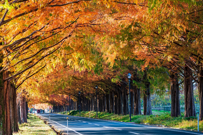 名所の多い京都周辺の見ごろは例年11月中~12月上旬。また、約500本が並ぶ滋賀県のメタセコイア並木(写真)なども同じころです。標高の高い和歌山県・高野山などは10月下旬~11月上旬です。