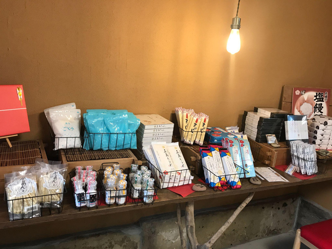 五島うどんの製麺所、天然塩の工房を構える「虎屋」。敷地内には販売所も併設し、ここだけの特産品を手に入れることができます。“島の魅力を活かした商品作り”をモットーに20種類以上のオリジナル商品を販売。「海塩」のほか、「五島うどん」「金の水餃子」「塩プリン」の4つを柱に据えています。
