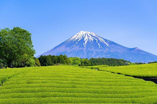 富士山南麓の大淵地区に広がる茶園。電柱などの人工物がないため、今も昔ながらの景観を保つ。緑が眩しい茶畑と雪をいただく富士山のコントラストが素晴らしく、多くの写真家も訪れる。