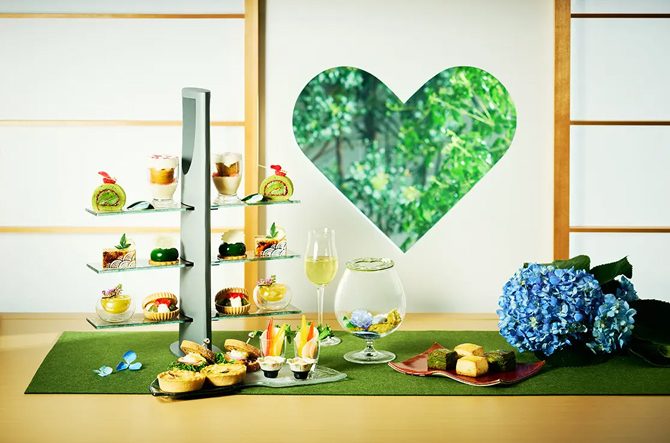 初夏を感じる緑鮮やかな抹茶スイーツのほか、ほうじ茶を使ったスイーツも登場。京都産のお茶を使ったアフタヌーンティーも楽しめます。