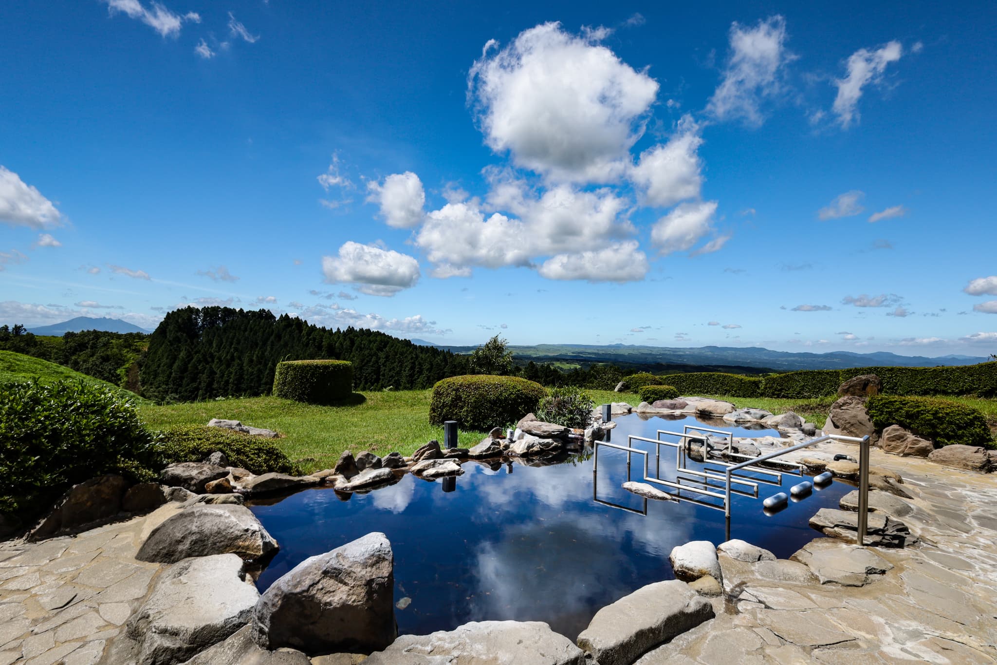 標高920mの瀬の本高原に位置する、リゾートホテル内の露天風呂で、その遮るものがない開放感は九州屈指!夜は照明が少なく、プラネタリウムのような満天の星を眺めることも。