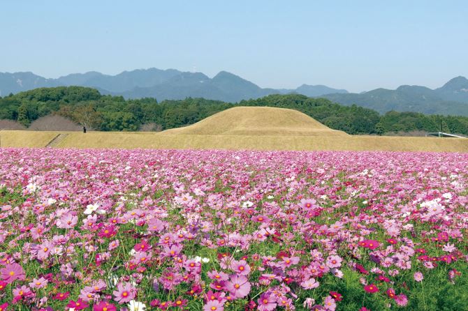 日本遺産に認定された西都原古墳群を彩る300万本のコスモス。なかでも画になるのは、シンボル的存在の鬼の窟古墳を背景にした一帯。背の低い品種のため、見事にコラボ!
