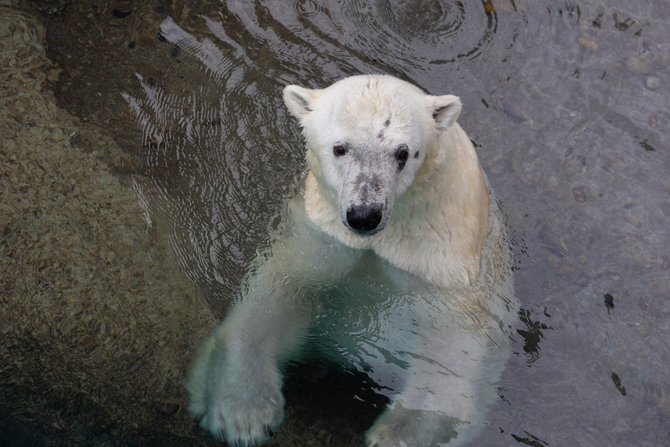 2頭のホッキョクグマ「クッキー」(メス)と「キャンディ」(メス)は「極地動物館」にいます。ごはんの時間(11時と14時30分)に立ち会うことができれば、エサのアジ(魚)を目がけてプールに飛び込む大迫力のダイビングが観察できるかもしれません。2頭とも好奇心旺盛で、ブイなど見慣れない物があるとプールの中でバシャバシャと泳ぎ回るそうです。