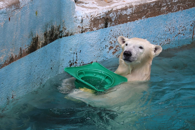 ホッキョクグマは母「バフィン」と、その娘「モモ」の2頭。バフィンは慎重な性格で、学習能力が高くポリタンクに入れた魚(アジ)を器用に取り出します。無邪気な性格のモモは、おもちゃで元気いっぱいに遊ぶ姿をよく見せてくれるのだとか。遠くから“ガラン、コロン、ドッシャーン”と聞こえたら、モモがプールに飛び込んだ音かも!?
