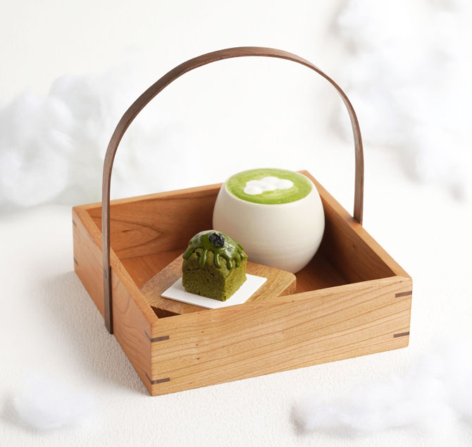 一番人気の「雲ノセット」は雲ノムースと雲ノ抹茶ラテのセット。竹のマグと竹籠が嵐山らしさを演出しています。