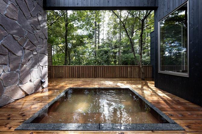 テーマは「森との没入感」。新設した森に佇むサウナもおすすめ。ベッドルームとウッドデッキがフラットに繋がる客室や森が一つの絵画のように映る窓など、温泉と自然が調和した唯一無二の空間が広がる。
