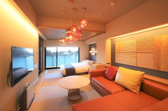 全室バルコニー付きの和モダンなデザインの「和える宿 高松」。4階フロアの客室はすべて露天風呂と開放感いっぱいのルーフテラス付きで、優雅にリラックスできる時間が過ごせる。