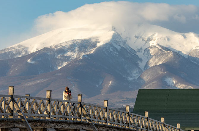 津軽富士見湖に架かる、三連太鼓橋。岩木山を背景にした橋の姿が、鶴が空に舞うように見えると言われています。雪景色の中の橋の姿も格別です。