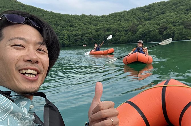 鳴子火山の火口湖であり、日本有数の強酸性湖として知られる潟沼は、温泉の源流を肌で感じられる象徴的なフィールドです。夏季には、静かな湖面をパックラフトで巡る「潟沼レイクツアー」を楽しむことができます。日によって変わる湖水の「鳴子ブルー」を楽しめるツアーです。