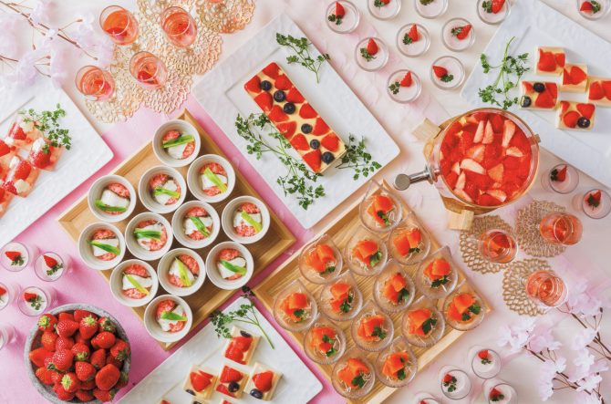 「ニジサクラ」の刺身や鯛の桜蒸し、苺のデザート、JURIN特製カレーなど約10種の春限定ハーフビュッフェで地元の味覚を贅沢に堪能。メインは、薪火で香ばしく焼き上げた蔵王和牛フィレの薪グリルへアップグレード。